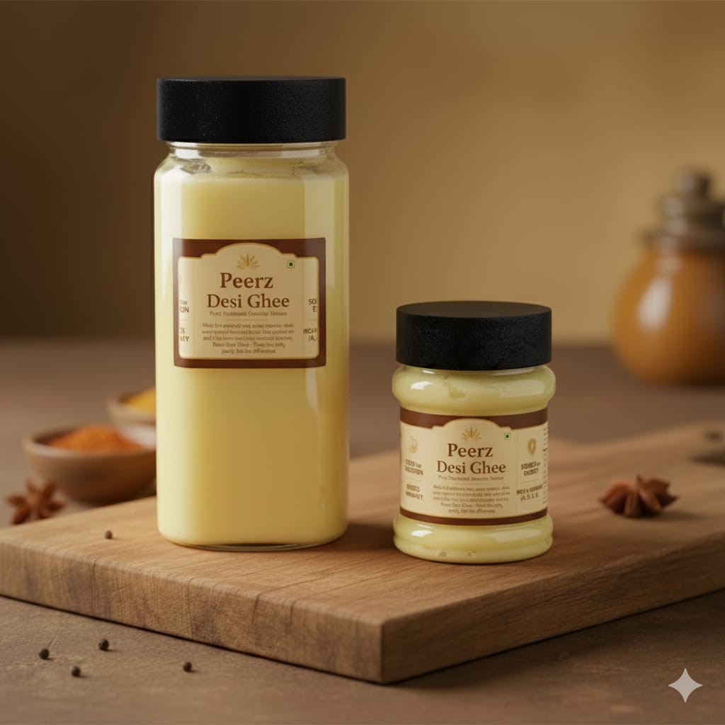 At Fruita Vegeta, we proudly offer Peerzlimited Pure Desi Ghee (Cow & Buffalo Mix) — made using a traditional slow-cooking process that preserves its granular texture, rich aroma, and pure, natural quality.